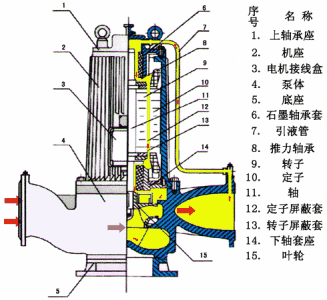 該泵為機泵一體結構,整機主要由泵體、葉輪、聯接體、滑動軸承、定子、轉子、屏蔽套、電機殼等零部件組成。泵為立式單級單吸離心式,進出口在同一水平軸線上,口徑規格相同可直接象閥門一樣安裝在管路的任何部位上,裝卸極為方便,占地面積省。泵通過聯接體與電機成一體,軸承采用進口石墨浸漬樹脂復合軸承,電機定轉子各有屏蔽套進隔離。軸承采用流體本身介質作為潤滑劑及冷卻液,具有設計合理、運行可靠的特點。泵設有底座,可直接安裝在地基上,因該泵具有低噪音,無振動特點,安裝時無需加裝隔振器或隔振墊。